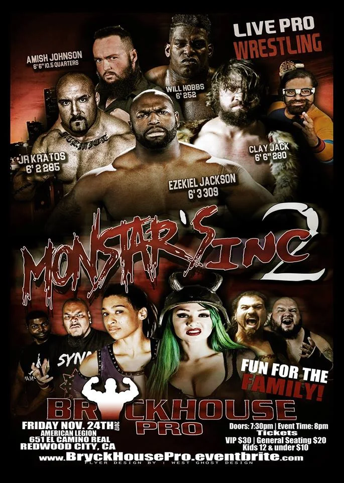 Brykhouse Pro Wrestling presents Monstar's Inc 2 Friday, November 24, 2017 8:00 PM 10:30 PM 20:00 22:30 Google Calendar ICS Location: 651 El Camino Real, Redwood City, California 94063Facebook Event PageBryckhouse Pro Wrestling Facebook Page