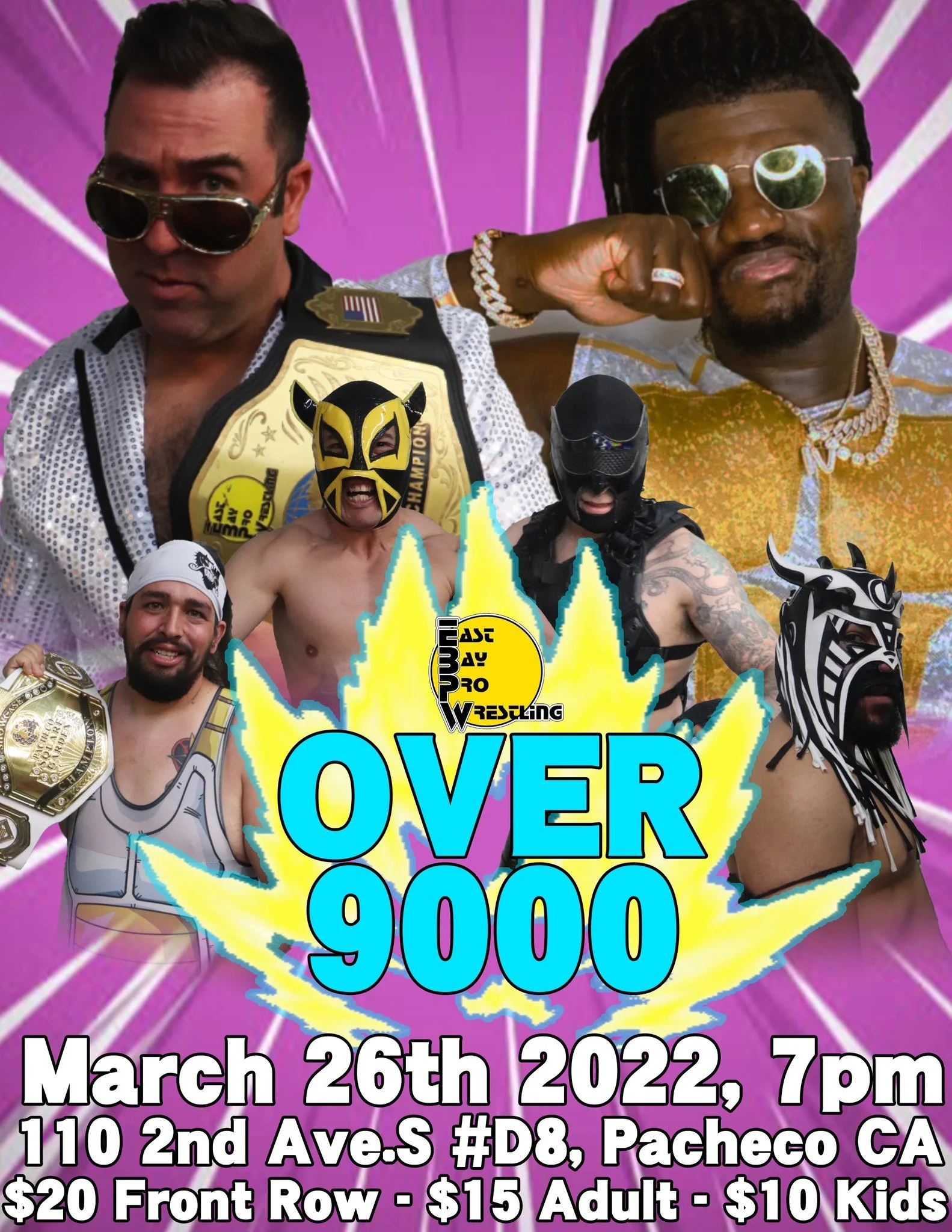 East Bay Pro Wrestling presents OVER 9000! Saturday, March 26, 2022 7:00 PM 9:00 PM 19:00 21:00 Google Calendar ICS Location: 110 2nd Ave S #d8 Pacheco, CA 94553Tickets Available at the DoorFacebook Event PageEBPW Facebook PageEBPW InstagramEBPW TwitterEBPW YouTube