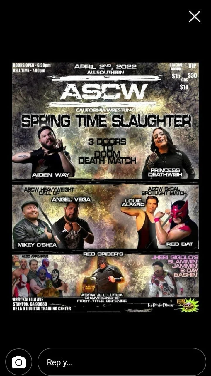 All Southern California Wrestling presents Spring Time Slaughter Saturday, April 2, 2022 7:00 PM 9:00 PM 19:00 21:00 Google Calendar ICS Location: 8381 Katella Ave Unit J Stanton, CA 90680Tickets Available at the DoorFacebook Event PageAll Southern California Wrestling FacebookAll Southern California Wrestling Instagram
