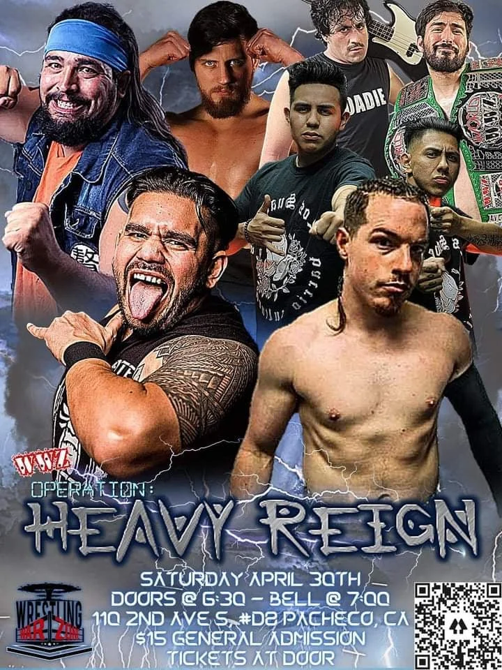 Wrestling War Zone presents Heavy Reign Saturday, April 30, 2022 7:00 PM 9:00 PM 19:00 21:00 Google Calendar ICS Location: 110 2nd Ave S #d8 Pacheco, CA 94553Tickets Available at the DoorWWZ Facebook PageWWZ TwitterWWZ YouTube