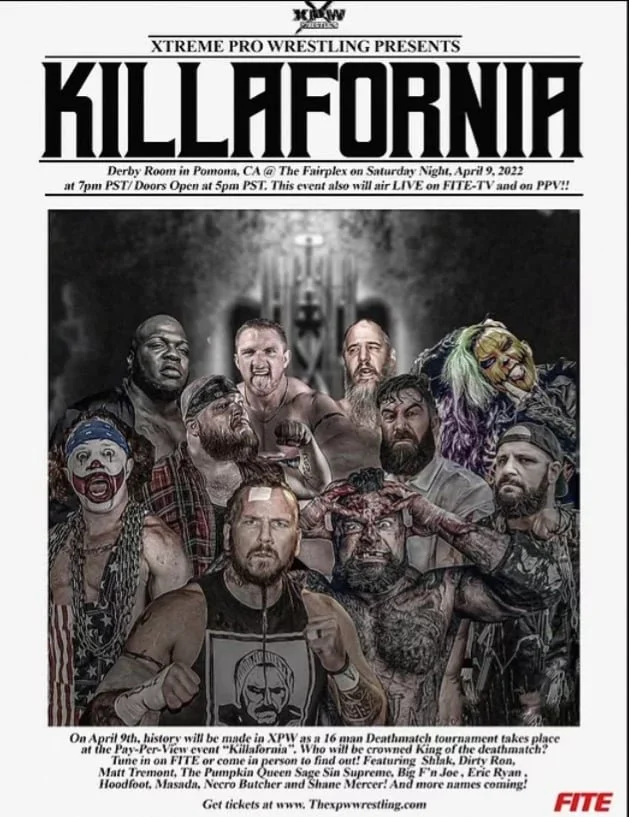 Xtreme Pro Wresting presents Killafornia Saturday, April 9, 2022 7:00 PM 9:00 PM 19:00 21:00 Google Calendar ICS Location: 2201 N White Ave Pomona, CA 91768Tickets: Tix.com