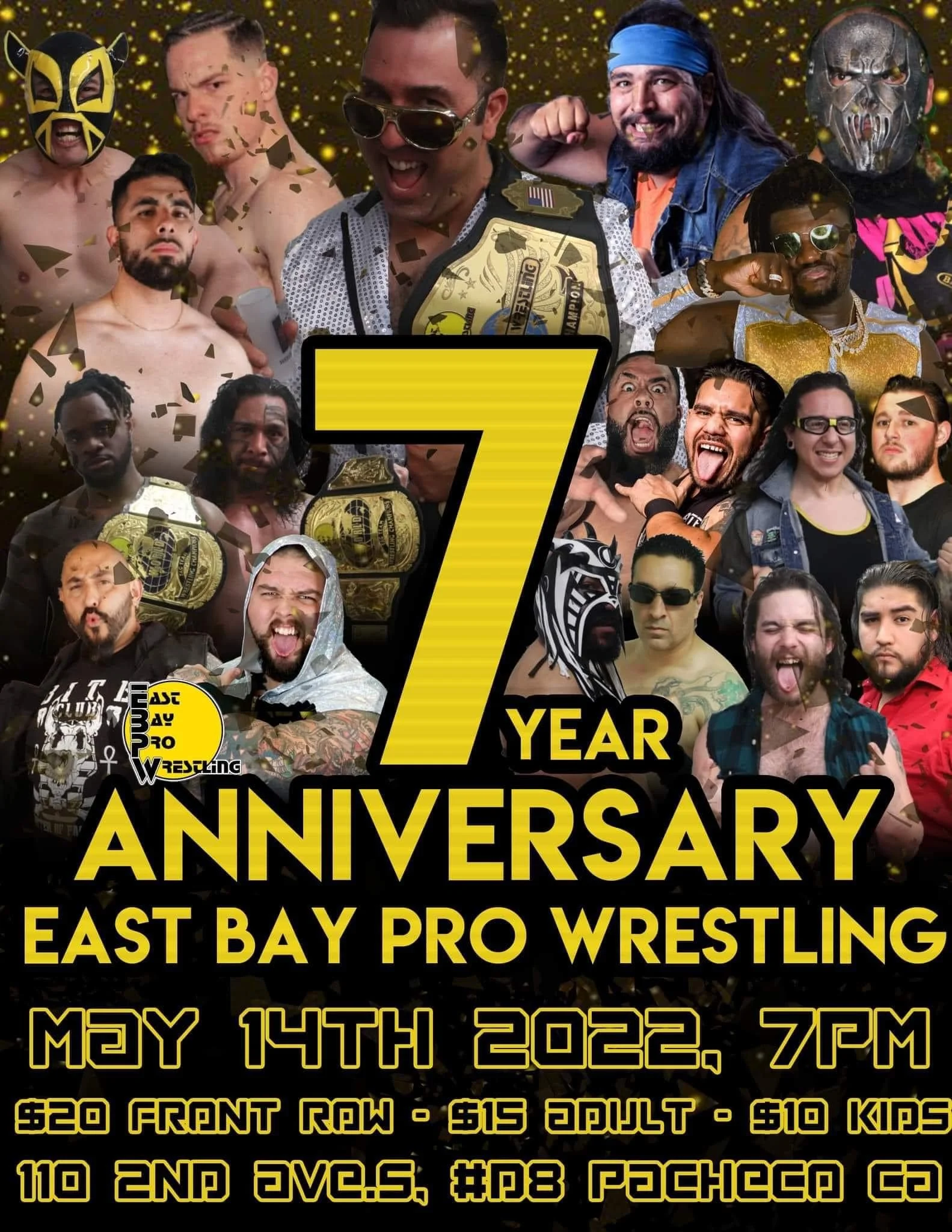 East Bay Pro Wrestling presents 7 Year Anniversary Saturday, May 14, 2022 7:00 PM 9:00 PM 19:00 21:00 Google Calendar ICS Location: 110 2nd Ave S #d8 Pacheco, CA 94553Tickets Available at the DoorEBPW Facebook PageEBPW InstagramEBPW TwitterEBPW YouTube
