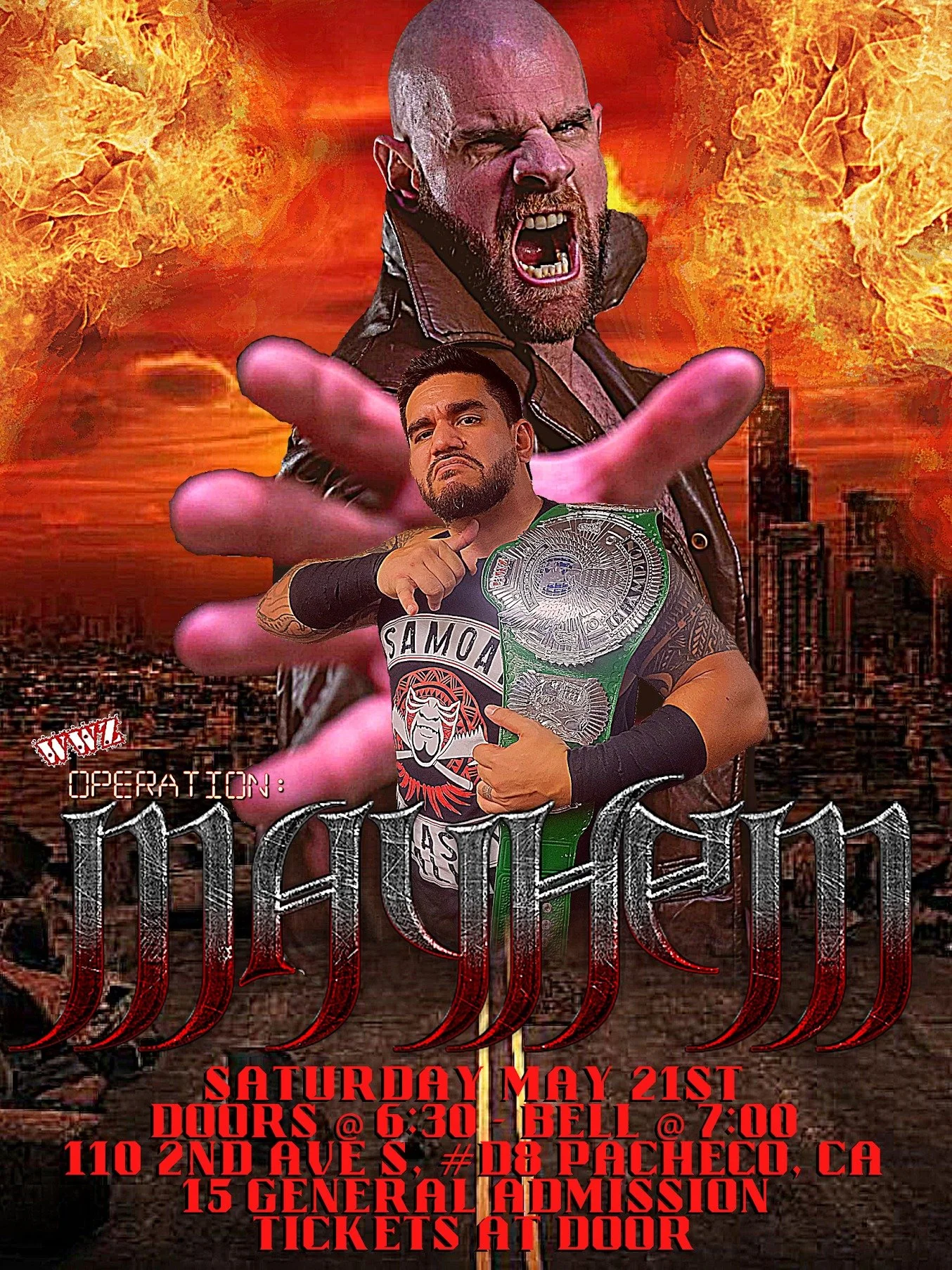 East Bay Pro Wrestling presents WWZ Operaton: Mayhem Saturday, May 21, 2022 7:00 PM 9:00 PM 19:00 21:00 Google Calendar ICS Location: 110 2nd Ave S #d8 Pacheco, CA 94553Tickets Available at the DoorWWZ Facebook PageWWZ TwitterWWZ YouTube