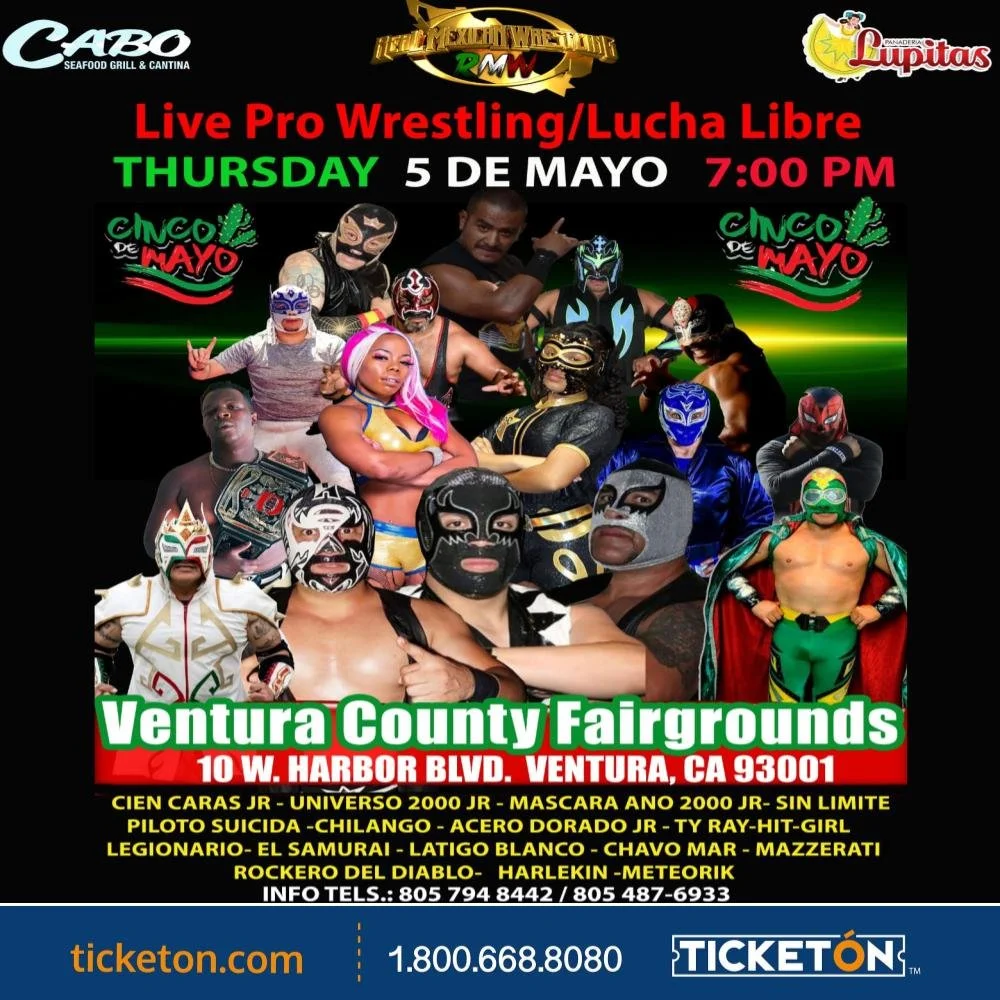 Lucha Libre Thursday, May 5, 2022 7:00 PM 9:00 PM 19:00 21:00 Google Calendar ICS Location: 10 W Harbor Blvd, Ventura, CA, 93001Tickets: Ticketon