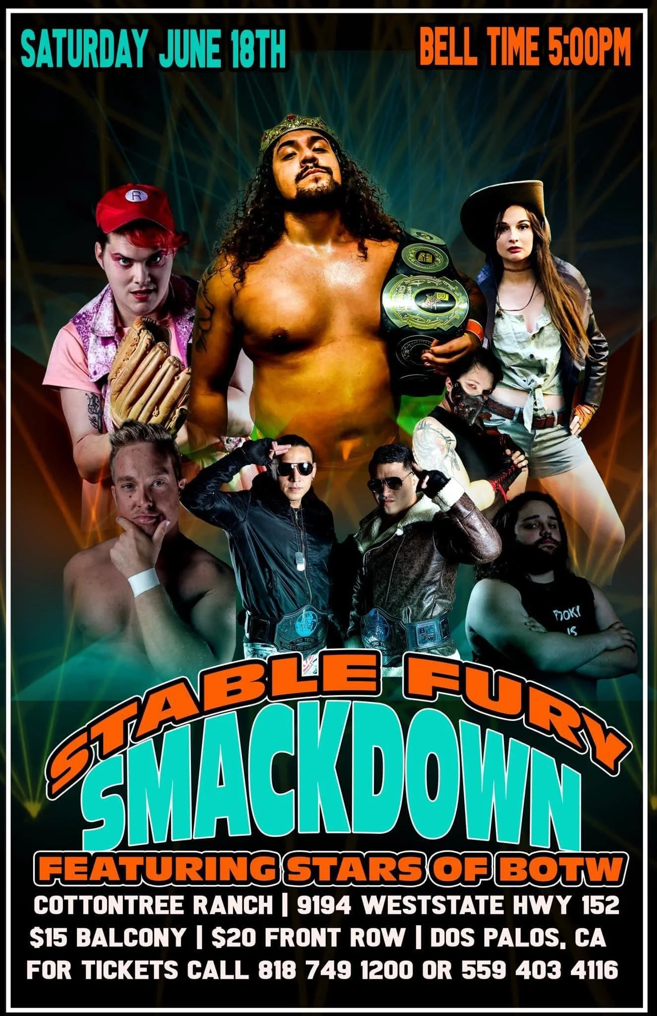 Stable Fury Smackdown Saturday, June 18, 2022 5:00 PM 7:00 PM 17:00 19:00 Google Calendar ICS Location: Cottontree Ranch 9194 CA-152, Dos Palos, CA 93620Tickets: 818-749-1200 or 559-403-4116