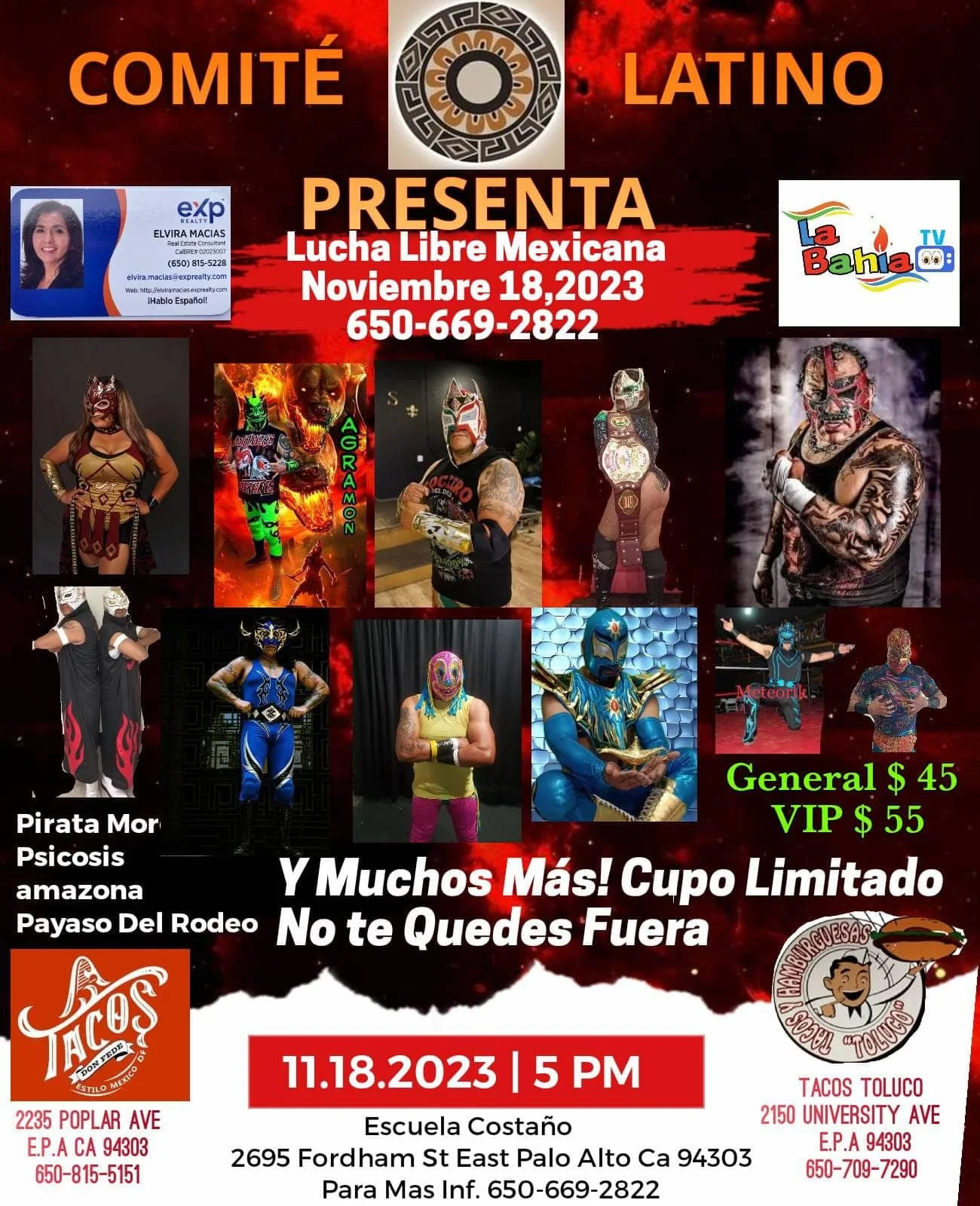 Lucha Libre Saturday, November 18, 2023 5:00 PM 8:00 PM 17:00 20:00 Google Calendar ICS Location: 2695 Fordham St, East Palo Alto, CA 94303Tickets Available at the Door