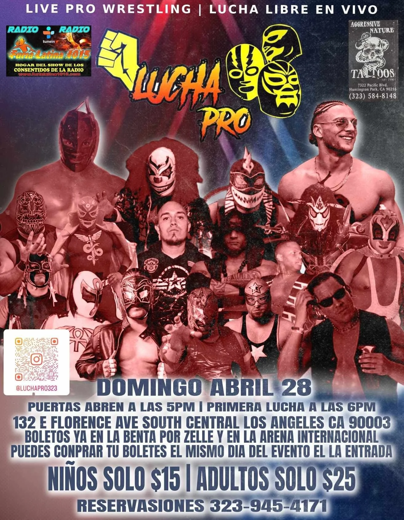 Lucha Pro Sunday, April 28, 2024 6:00 PM 9:00 PM 18:00 21:00 Google Calendar ICS Location: 132 E Florence Ave, Los Angeles, CA 90003Tickets Available at the DoorLucha Pro FacebookLucha Pro Instagram