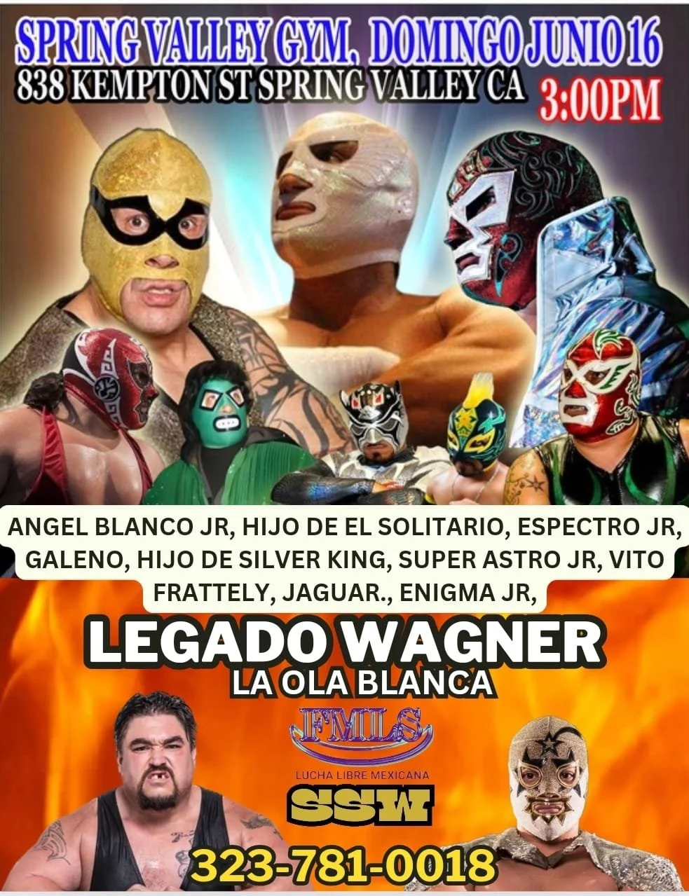 FMLS Lucha Libre Sunday, June 16, 2024 3:00 PM 6:00 PM 15:00 18:00 Google Calendar ICS Location: 838 Kempton St, Spring Valley, CA 91977Tickets Available at the DoorFMLS LUCHA LIBRE FacebookFMLS LUCHA LIBRE InstagramFMLS LUCHA LIBRE TwitterFMLS LUCHA LIBRE Website