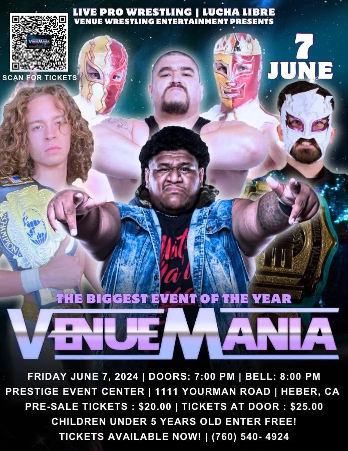 Venue Wrestling Entertainment presents VenueMania Friday, June 7, 2024 8:00 PM 10:00 PM 20:00 22:00 Google Calendar ICS Location: 1111 Yourman Rd, Heber, CA 92249Tickets Available at the DoorVenue Wrestling Entertainment FacebookVenue Wrestling Entertainment YouTubeVenue Wrestling Entertainment Website