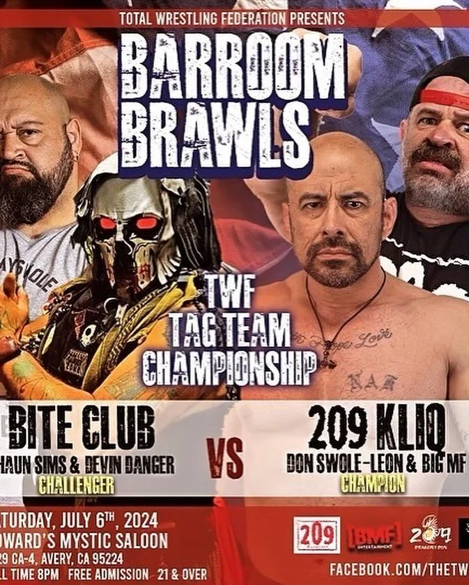 Total Wrestling Federation presents Barrooms Brawl Saturday, July 6, 2024 8:00 PM 10:00 PM 20:00 22:00 Google Calendar ICS Location: 4529 CA-4, Avery, CA 95224Tickets Available at the DoorTotal Wrestling Federation Facebook PageTotal Wrestling Federation InstagramTotal Wrestling Federation YouTube