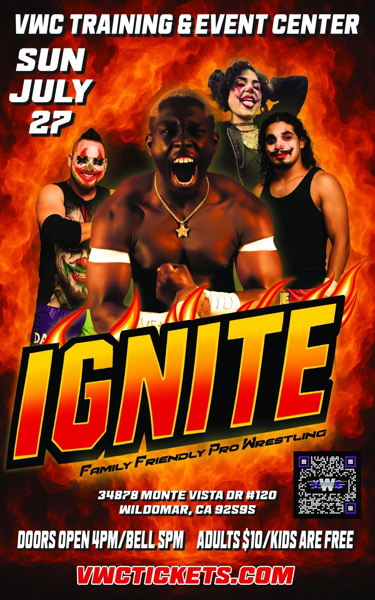 Valley Wrestling Connection presents Ignite Sunday, July 27, 2025 5:00 PM 8:00 PM 17:00 20:00 Google Calendar ICS Location: 34878 Monte Vista Dr #120 Wildomar, CA 92595Tickets: valleywrestlingconnection.comValley Wrestling Connection FacebookValley Wrestling Connection InstagramValley Wrestling Connection YouTubeValley Wrestling Connection Website