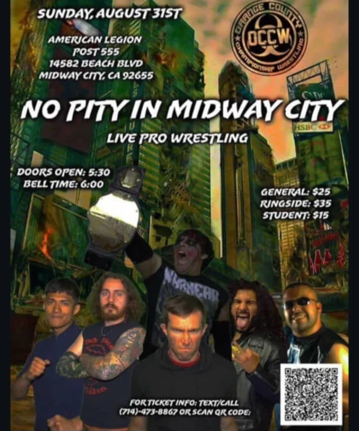 Orange County Championship Wrestling Sunday, August 31, 2025 6:00 PM 8:00 PM 18:00 20:00 Google Calendar ICS Location: 14582 Beach Blvd, Midway City, CA 92655Tickets Available at the Door
