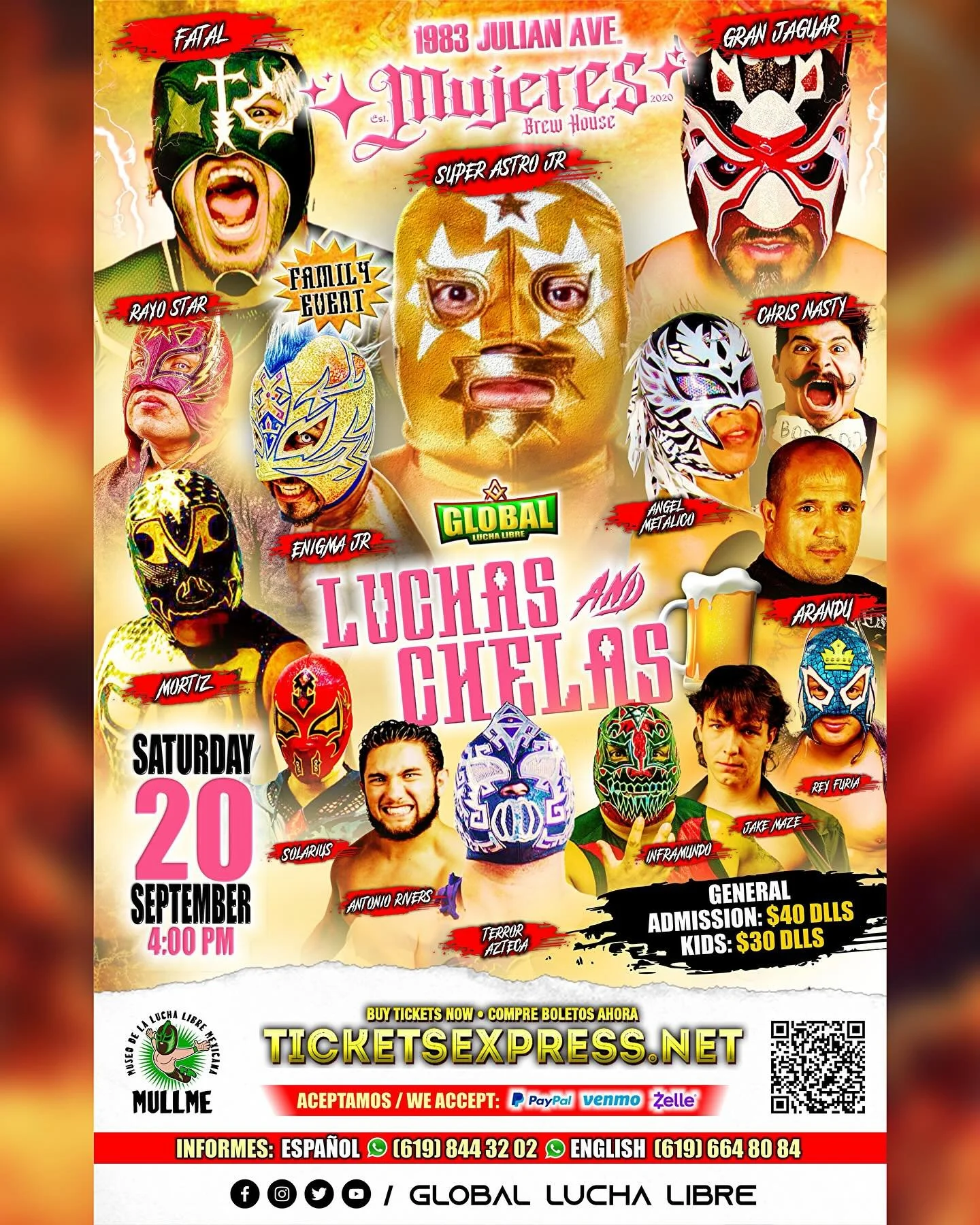 Global Lucha Libre Saturday, September 20, 2025 4:00 PM 6:00 PM 16:00 18:00 Google Calendar ICS Location: 1983 Julian Ave, San Diego, CA 92113Tickets: TicketsExpressGlobal Lucha Libre FacebookGlobal Lucha Libre Instagram